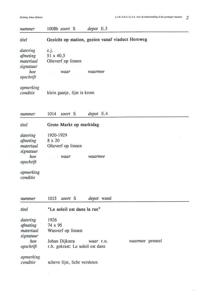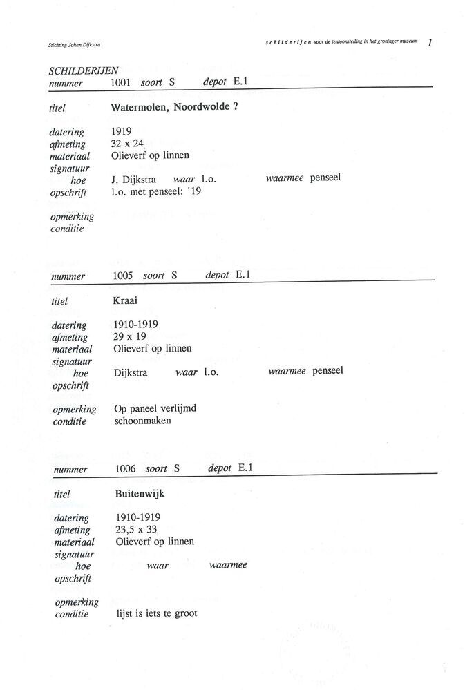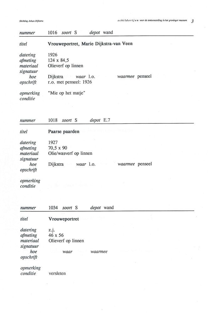 Stichting Johan Dijkstra. Lijst van werken voor de tentoonstelling in het Groninger Museum 1996/1997
