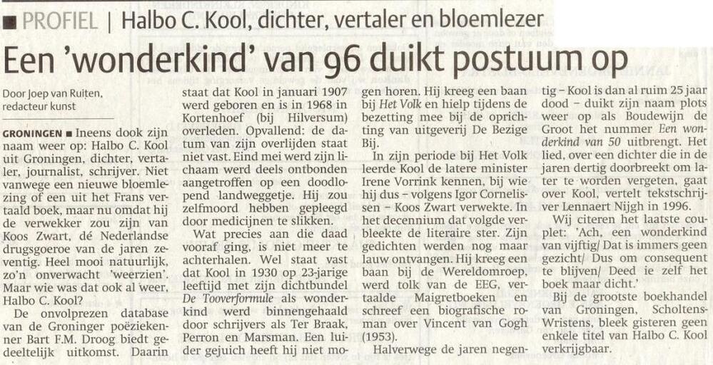 'wonderkind' van 96 duikt postuum op : Halbo C. Kool, dichter, vertaler en bloemlezer